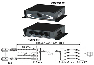 Combiner bzw. Splitter für Videoübertragungssysteme mit CAT5 Kabeln. Mit diesem Verteiler werden 4 einzelne Signale in ein gemeinsames Kabel kombiniert oder aus dem Kabel wieder in 4 einzelne Signale gesplittet.
