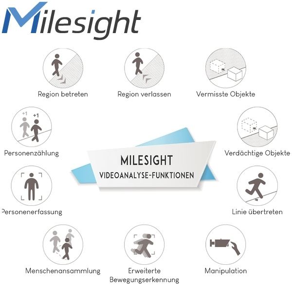 Erweiterte Bewegungserkennung, Linie übertreten, Region betreten, Region verlassen, Manipulationserkennung, Ansammlungs-Erkennung, Personenerfassung, Personenzählung, vermisste Objekte, verdächtige Objekte.