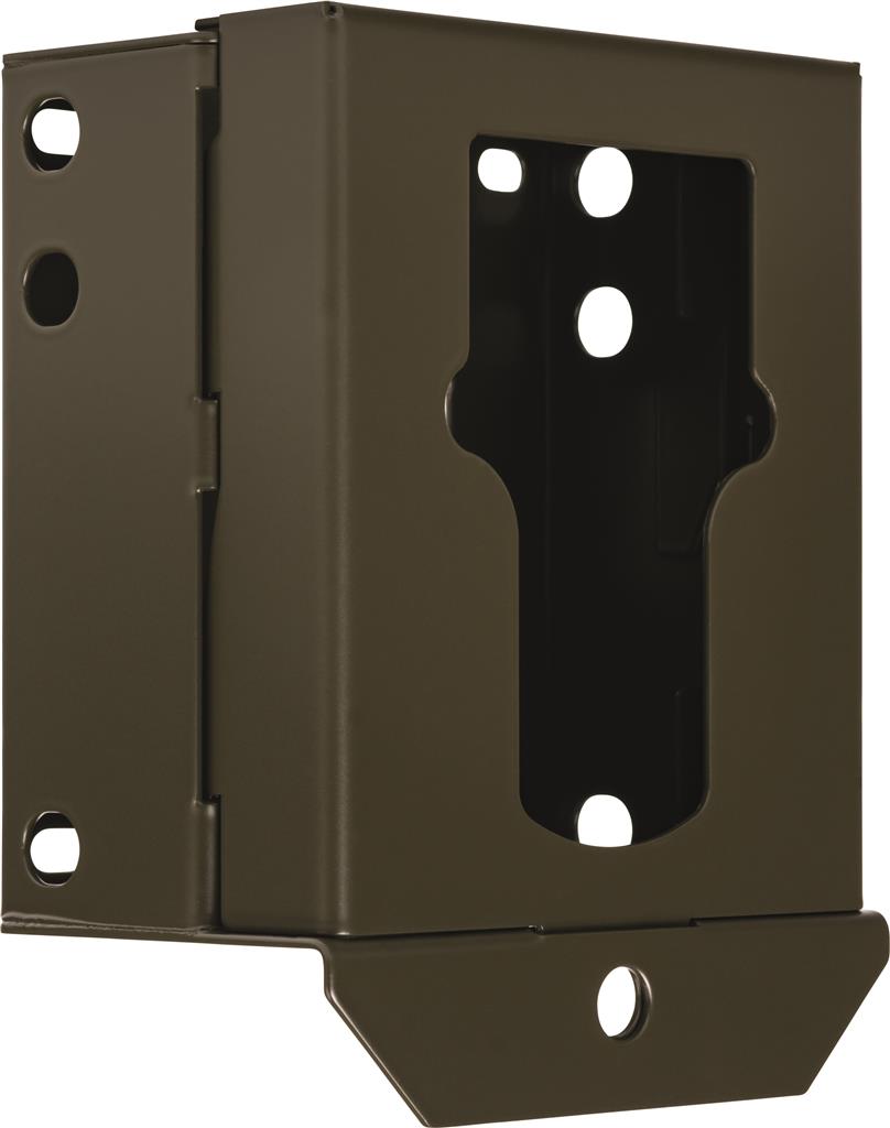 Eine Vielzahl von Öffnungen auf der Rückseite des Gehäuses bieten variable Befestigungsmöglichkeiten. Den besten Schutz vor Diebstahl erreichen Sie, wenn Sie das Gehäuse an einen Baum schrauben oder mit Schrauben und Dübeln an einer Wand befestigen.